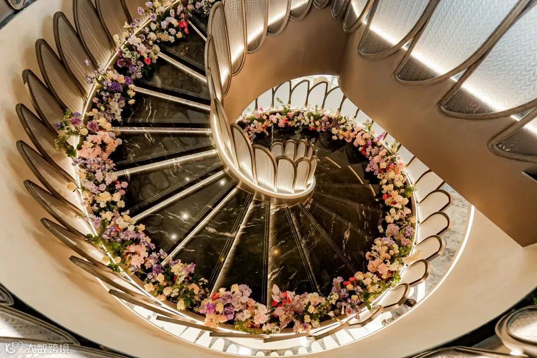 摩登旋转楼梯。楼梯已经贴上了定制的叶片状玻璃栏杆,朦朦胧胧的透光感,将会所旋梯的审美力,又拉上一个全新的高度。
