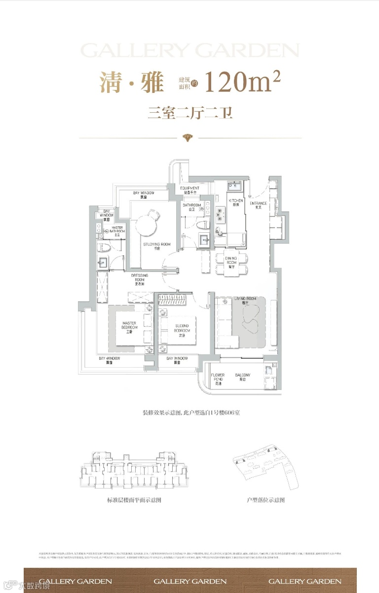建面约120㎡户型,定制LDKB一体化宽厅,双270°转角窗设计市场罕见,整个房间通透性很好,实现居住品质与观景的完美结合。