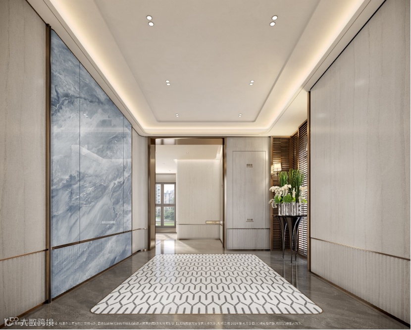 地库入户大堂公区打造,招商臻境同样也极尽匠心,吊顶上采用了具有海派风格的内凹式弧面造型;廊柱腰线以及门边运用奢石点缀,柱子与柱体采用精致的弧形倒角设计,庄重而不失典雅。