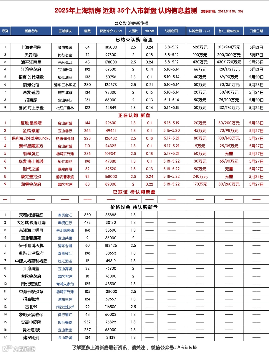 截至目前,上海新房 2025年上海新房近期35个待入市的新盘(近期将开盘新盘&近期待入市8个过会新盘)已有18盘发布了认购时间,其中9盘已结束认购,9盘正在认购!