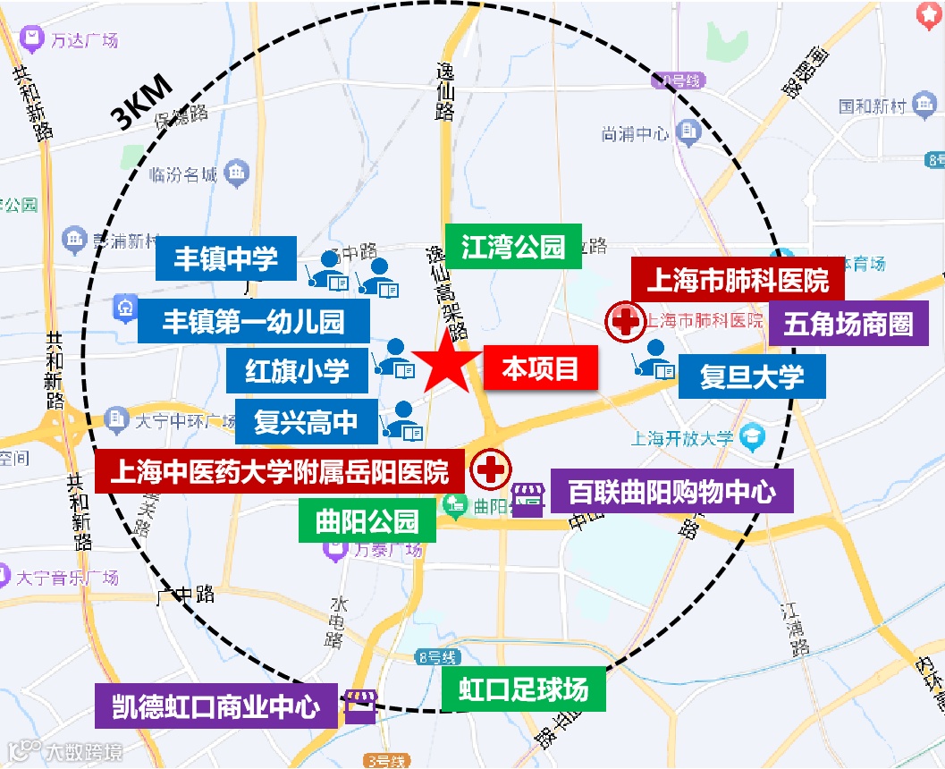 上海中医药大学附属岳阳中西医结合医院(三甲)距离项目直线约1.5公里;同济大学附属上海市第四人民医院(二甲)距离项目直线约1.6公里。