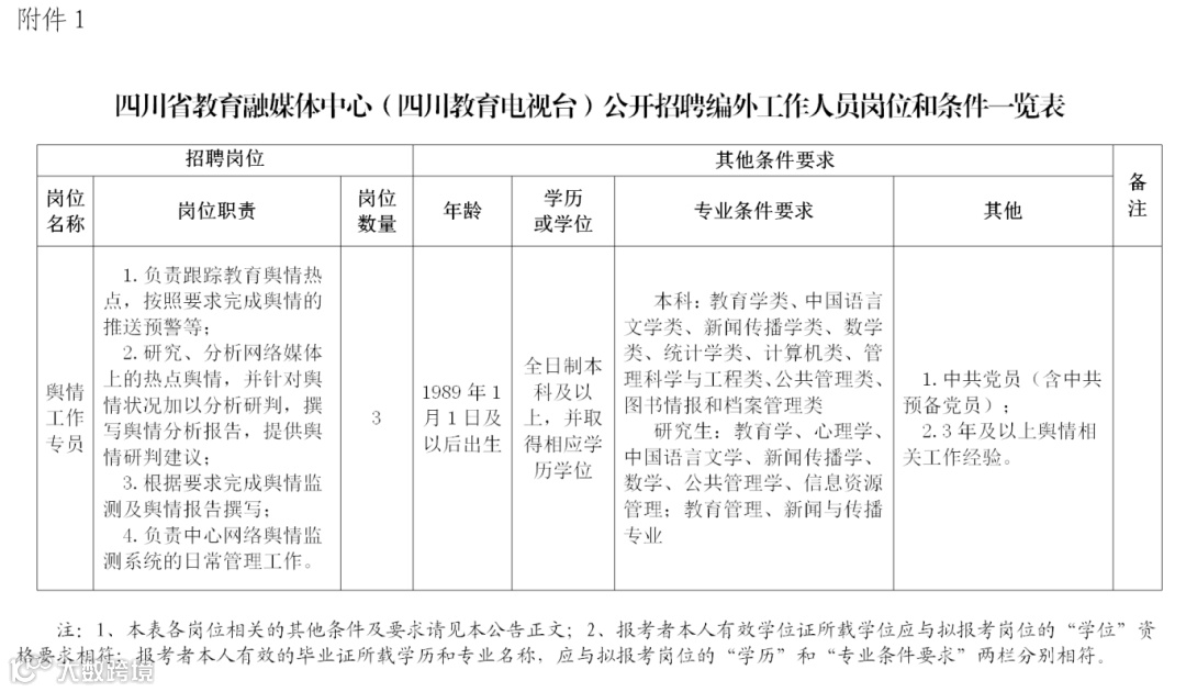 因工作需要,根据《中共四川省委教育工委 四川省教育厅直属事业单位编外人员管理暂行办法》,四川省教育融媒体中心(四川教育电视台)拟面向社会公开招聘舆情工作人员,现将公开招聘有关事项公告如下[本公告在省教育厅官网(http://edu.sc.gov.cn/,下同)和单位官网(https://rmt.sc.edu.cn/,下同)上发布]。