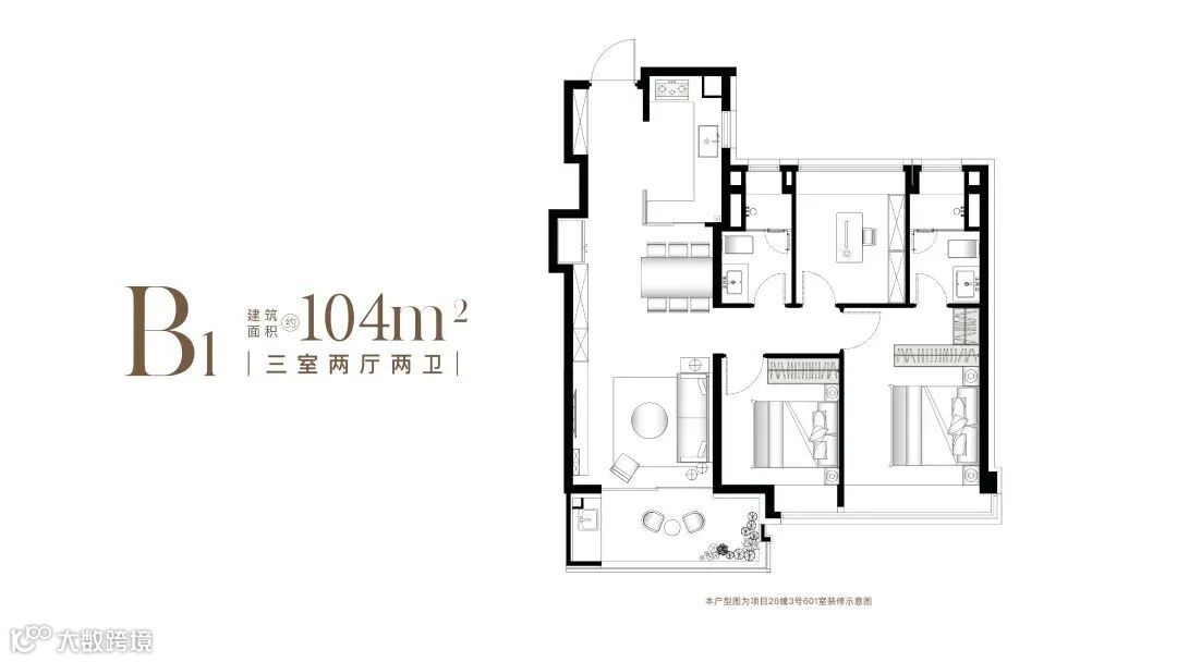 ②建面约104㎡B1户型:3房2卫进阶改善,适配更长家庭周期!