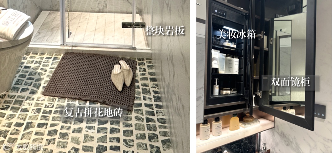 室内圆弧吊顶等采用弧形线条设计,卫生间标配美妆冰箱及双面镜柜,演绎海派美学精致感。