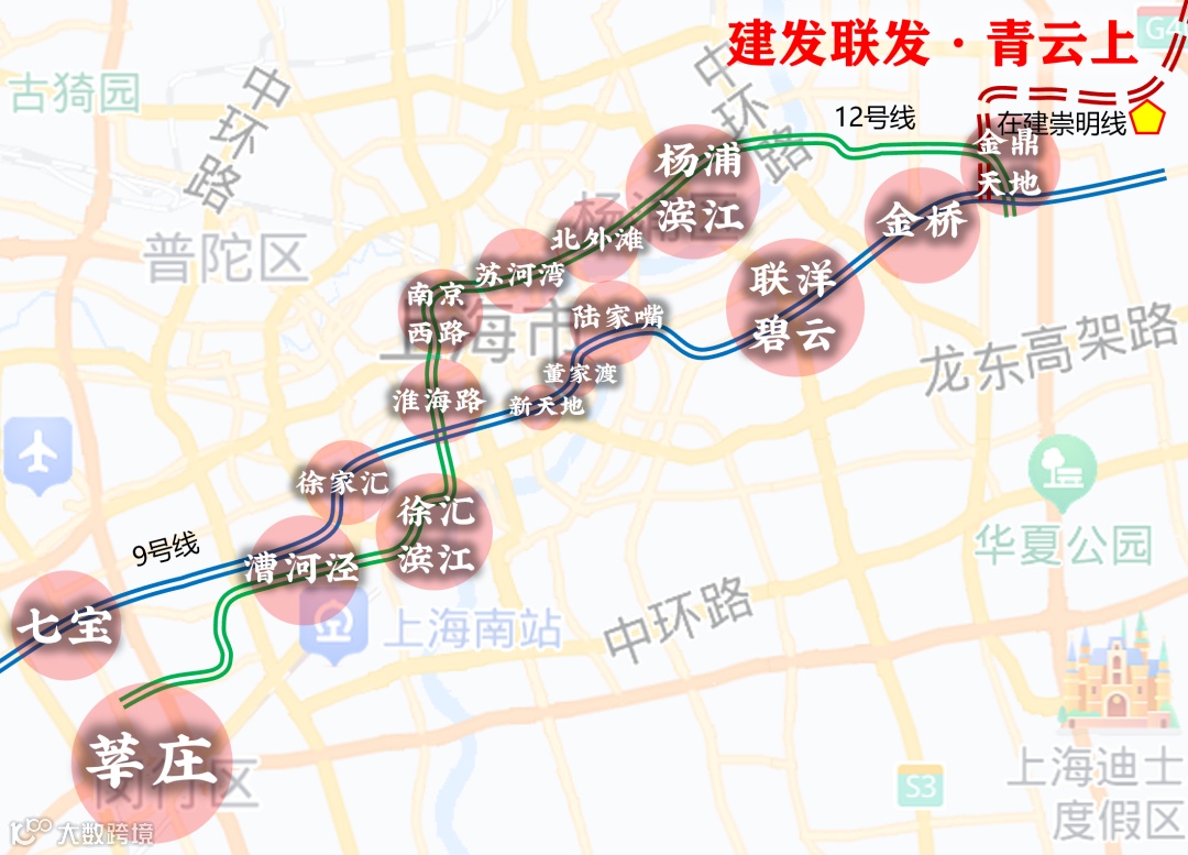 而且2站换乘12号线,还可以通过9号线3站直达金桥(金桥开发区),高效联通市中心重要CBD,以及各大城市副中心