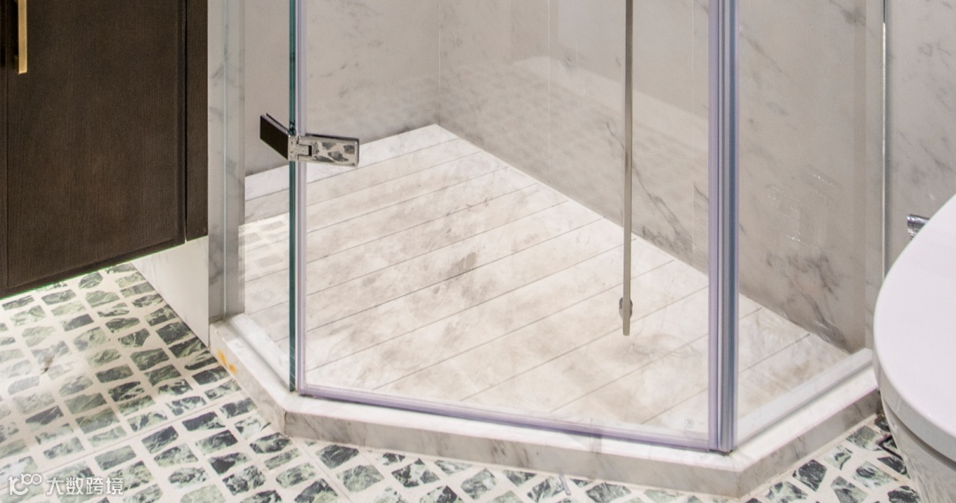 进入卫生间,地面墙面几乎全部是奢石包裹,墙面是落地仿汉白玉高级岩板,地面是定制的绿色仿古砖。