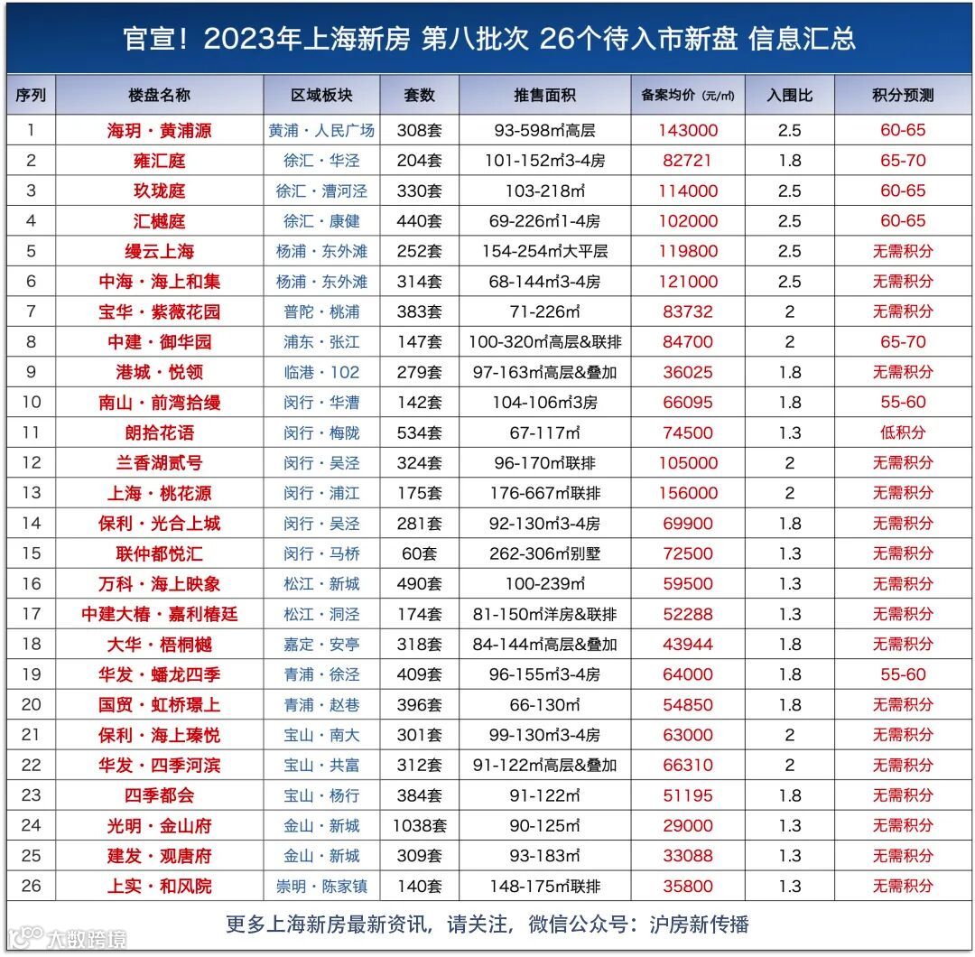 2033年上海新房 第八批次 26个待入市新盘 信息汇总