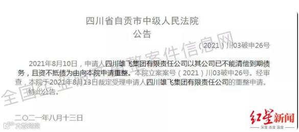 事情缘由是这样的,近日四川雄飞集团已向法院申请破产重整。据四川省自贡市中级人民法院(2021)川03破申26号公告显示:2021年8月10日,申请人四川雄飞集团有限责任公司以其公司已不能清偿到期债务,且资不抵债为由向法院申请重整。经审查,法院于2021年8月13日裁定受理申请人四川雄飞集团有限公司的重整申请。