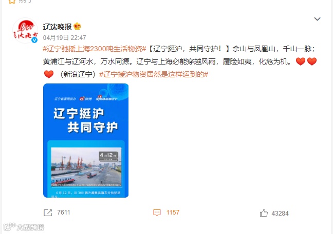 4月19日,辽宁媒体发微博,以图文的形式讲述了物资运输到上海的过程,时间线清晰。带的话题为“辽宁驰援上海2300吨生活物资”,和“辽宁援沪物资居然是这样运到的”。