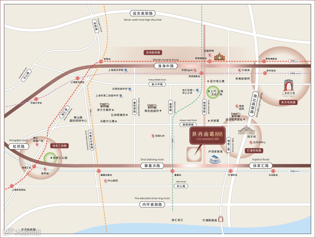 陕西南路888位于陕西南路肇嘉浜路口,属双轨地铁房:距离地铁9号线、12号线嘉善路站直线距离约150米。