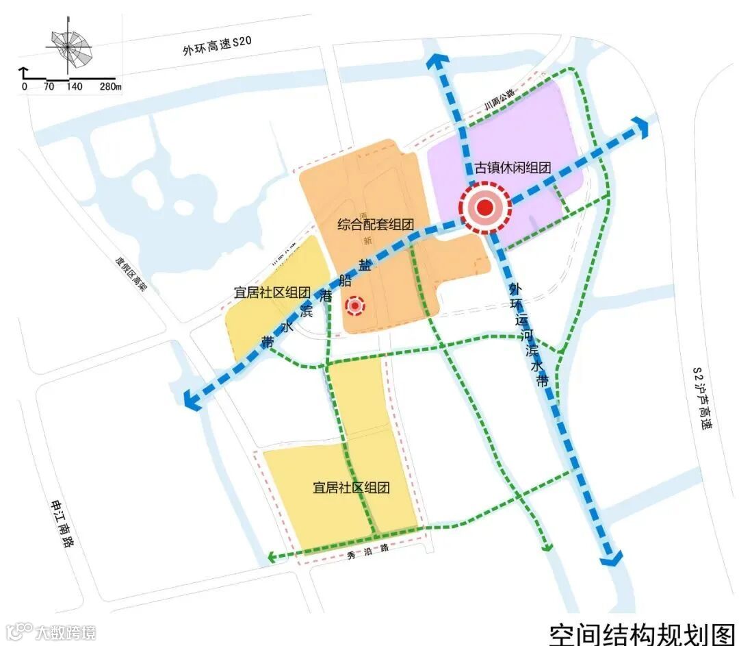 这里将形成“一心、两廊、三组团”的总体空间结构,即以横沔老街历史文化风貌区为核心,保护并延续盐船港和外环运河十字浜水廊的空间格局,形成以古镇休闲、综合配套、宜居社区为主要功能的三大组团。