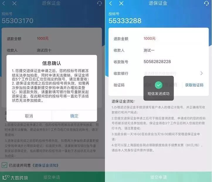 PS:提交退保证金申请之后,您的投标号将被冻结无法参加拍卖,同时申请无法撤销,保证金将在5个工作日之后汇往客户指定的账号。拍卖会前一天16:00至拍卖会当天16:00期间不受理退保证金申请。