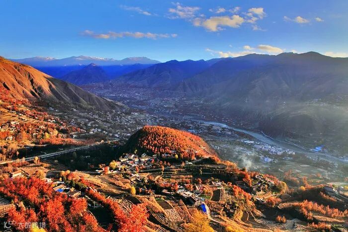树木迎着朝阳在地面上留下长长的影子,鳞次栉比的房屋上云烟缭绕,高耸的古碉楼,万山红遍的河畔,让人看的如痴如醉