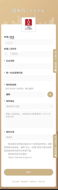 单位法人或员工可通过“法人一证通”或电子营业执照登录“随申码”开放平台(PC版),点击申请“场所码”。填写相关信息,审核通过后即可下载使用。