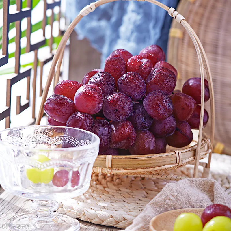 浪漫红颜上的白霜是新鲜的象征,紫红色的果实看起来就非常诱人。颗粒饱满坚挺的葡萄无肉囊,就像一颗吃撑的小肚皮,轻咬一口,就会碰破葡萄皮。