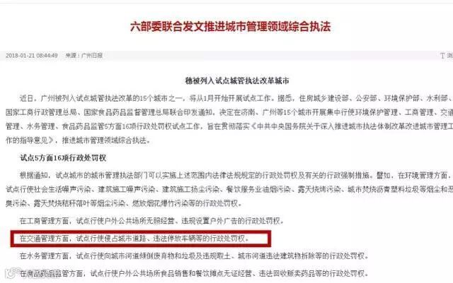 其中,《通知》指出:在交通管理方面,城管可试点行使侵占城市道路、违法停放车辆等的行政处罚权。
