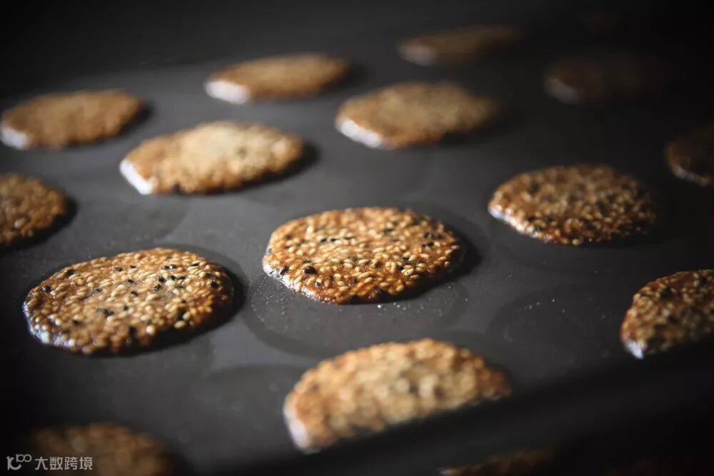 但这款芝麻薄片,是用大量鸡蛋搭配少量面粉调和,再撒上足量、新鲜的黑白芝麻,烘烤而成。