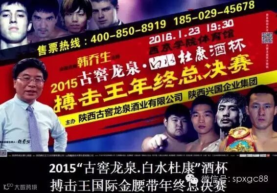 此次2015“古窖龙泉.白水杜康”酒杯搏击王国际金腰带年终争霸赛是由陕西古窖龙泉酒业有限公司主办的一场专业性及观赏性极强的搏击类体育运动。