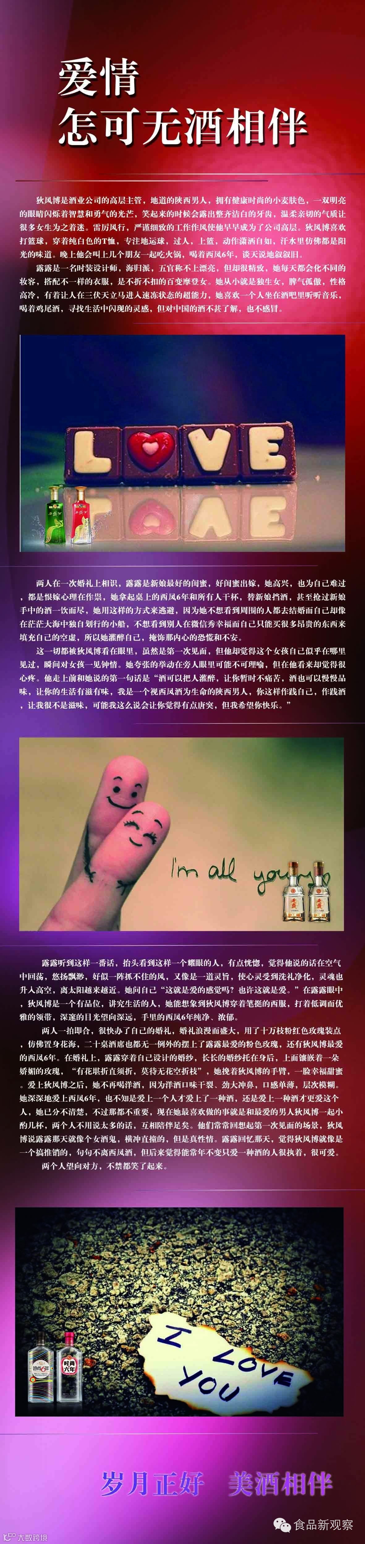 两人一拍即合,很快办了自己的婚礼,婚礼浪漫而盛大,用了十万枝粉红色玫瑰装点,仿佛置身花海,二十桌酒席也都无一例外的摆上了露露最爱的粉色玫瑰,还有狄风博最爱的西凤6年。在婚礼上,露露穿着自己设计的婚纱,长长的婚纱托在身后,上面镶嵌着一朵娇媚的玫瑰,“有花堪折直须折,莫待无花空折枝”,她挽着狄风博的手臂,一脸幸福甜蜜。爱上狄风博之后,她不再喝洋酒,因为洋酒口味干裂、劲大冲鼻,口感单薄,层次模糊。她深深地爱上西凤6年,也不知是爱上一个人才爱上了一种酒,还是爱上一种酒才更爱这个人,她已分不清楚,不过那都不重要,现在她最喜欢做的事就是和最爱的男人狄风博一起小酌几杯,两个人不用说太多的话,互相陪伴足矣。他们常常回想起第一次见面的场景,狄风博说露露那天就像个女酒鬼,横冲直撞的,但是真性情。露露回忆那天,觉得狄风博就像是一个搞推销的,句句不离西凤酒,但后来觉得能常年不变只爱一种酒的人很执着,很可爱。