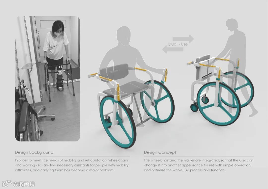 In order to meet the needs of mobility and rehabilitation, wheelchairs and walking aids are two necessary assistants for people with mobility difficulties, and carrying them has become a major problem . The wheelchair and the walker are integrated, so that the user can change it into another appearance for use with simple operation, and optimize the whole use process and function.