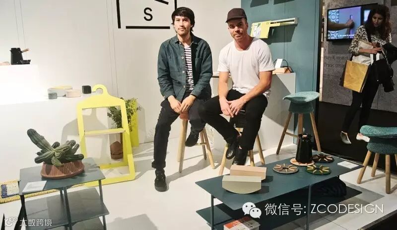 设计师Jonah Takagi(左)和策划者 Matt Carr在ICFF上Umbra Shift的摊位;Takagi底下坐的椅子和一边的咖啡桌,都在今年夏天推出。