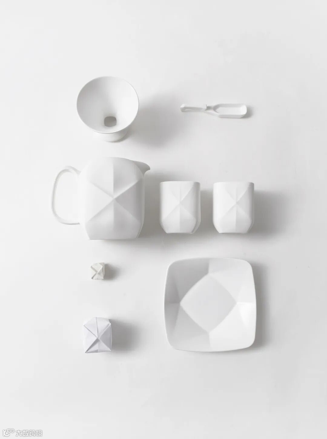 结合陶瓷材质的特点与工艺,对折纸形态进行提取,设计了《纸球系列》与《千纸鹤系列》手冲咖啡具,充分展现点、线、面的形式美感。