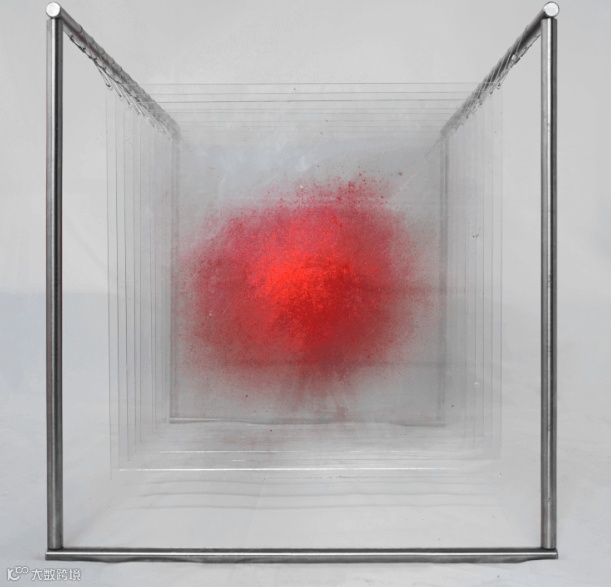 以新冠疫情期间确诊人数为灵感,在14层玻璃上,用色粉来展示,立体呈现这次事件的形状。