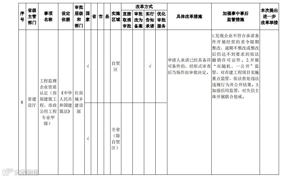 8月11日,浙江省住建厅印发《浙江省深化住房城乡建设领域“证照分离”改革全覆盖试点工作实施方案》。方案指出,在全省范围内,对11项涉企经营许可事项实行告知承诺,明确“申请人作出承诺的,经形式审查后可当场作出审批决定”。包括:工程造价咨询企业乙级资质认定;