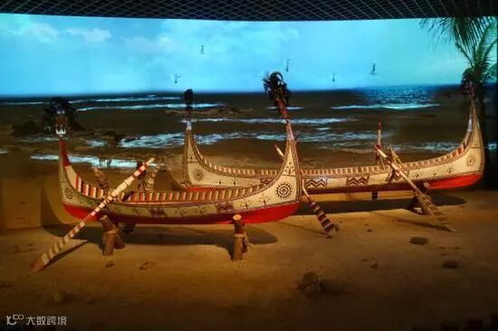 展厅“雕刻工艺”之“高山族彩绘木雕渔船”展示部分,两艘彩绘小木舟静静停靠,背景是用LED高清投影灯营造出的动态大海。