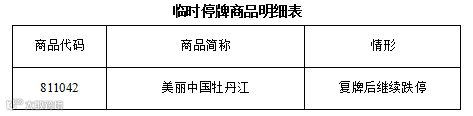 因本所《美丽中国牡丹江》(交易代码811042)交易商品复牌后继续跌停,为加强交易风险管理、保护投资者利益,根据《湖南文化艺术品产权交易所邮币卡现货托管交易风险控制管理办法(暂行)》等相关规定,经本所风险控制委员会研究决定,将以下商品于2017年2月14日暂停交易一天,并于2017年2月15日恢复交易。