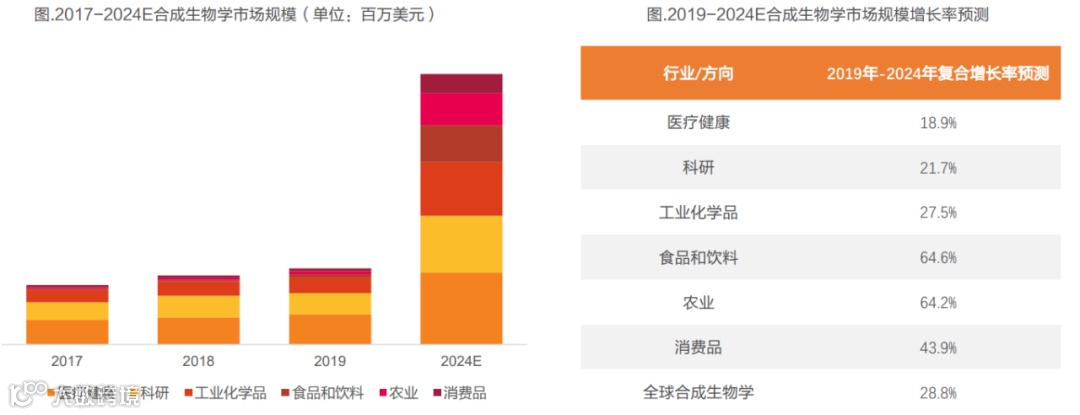 根据 CB Insights 分析数据显示,全球合成生物学市场规模2019年为53亿美元,预计到2024年将达189亿美元,年复合增长率为28.8%。