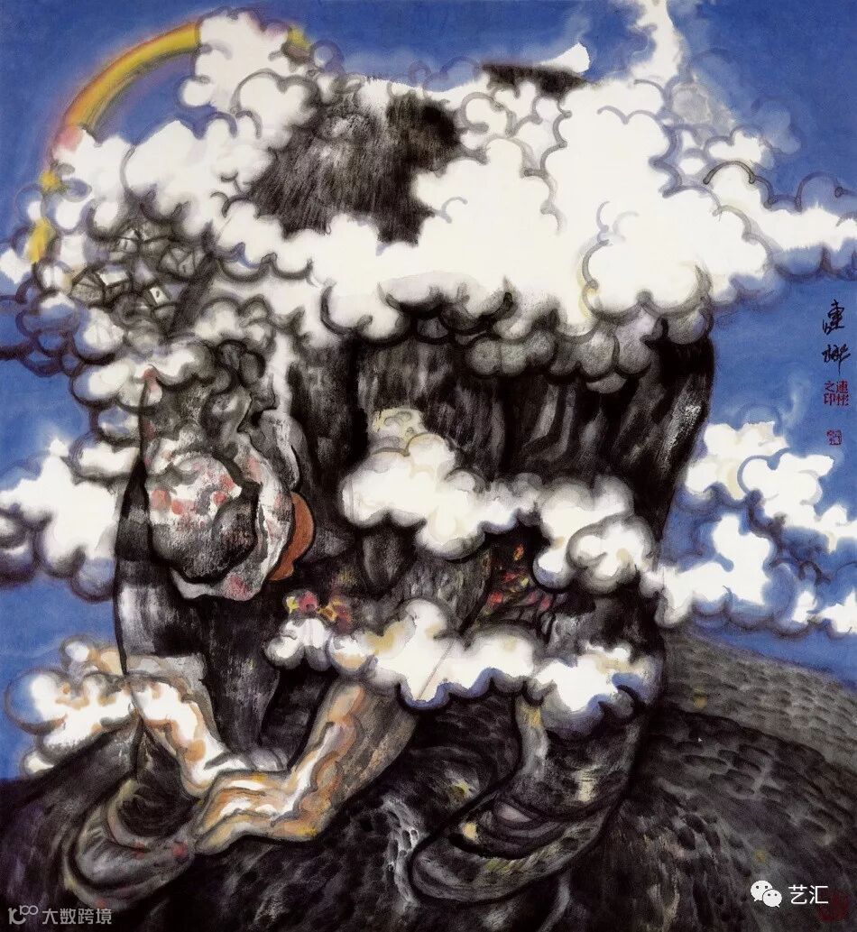 在他的形式语言中,选择高原云朵作为个性符号。在精神层面与形式语言层面达到同构展示,在精神层面体现了对传统文化中祈福吉祥内涵的吸纳传承,云朵在他的作品中被赋予吉祥内涵,用团块和球形的滚动态势成为作品结构的一个中介环节。运用笔墨的表现,通过圆润的线与墨气的交织纵横,形成云形、云气掩映下的神秘莫测的梦的境地。在水墨画用墨单纯表现的同时大胆用色,这在他作品中又体现出另一特征,即浓墨重彩与水墨单色黑白渲染有节奏地突出互换,减弱一种状态给人造成疲劳的可能性,加强其视觉对人深层思维的冲击。整体上说,他的作品注重画面的气势,不乏恢宏和壮美,并用浪漫主义的抒情畅想塑造天地吉祥的生命交响。