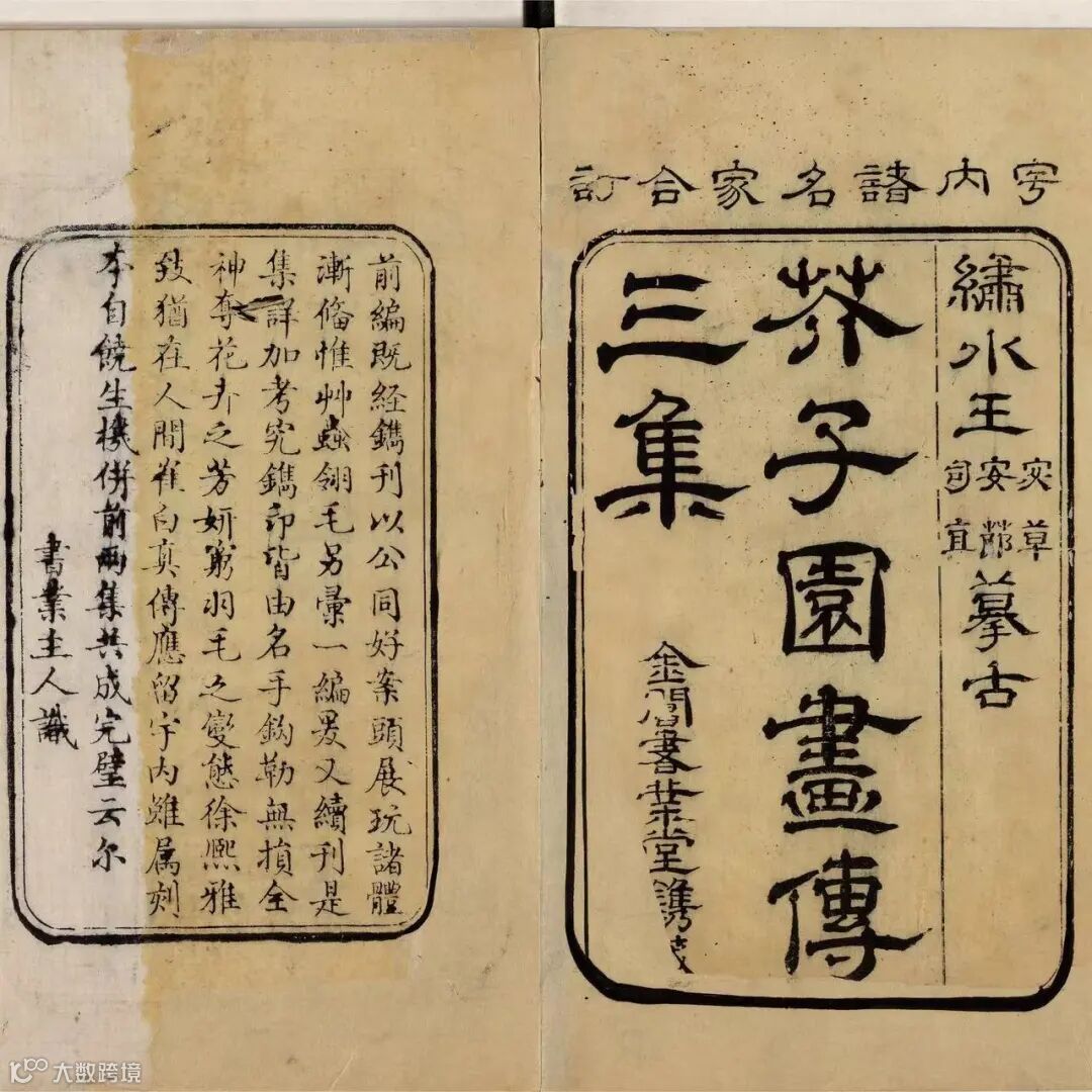 芥子园是清代著名戏曲家李渔的别墅。《芥子园画传》实为李渔的女婿沈心友托王概编的画谱。后由王概、王蓍、王臬三兄弟斟酌增改,木刻套版精印而成,共三集。王概,字安节,秀水(今属浙江省)人,寓居金陵(今南京市),擅作大幅山水;兄王蓍,字宓草,擅花鸟;弟名臬,字习直,亦擅画。此书一集为画学浅说,后列树、石、人物、屋宇等绘画方法;二集为兰、竹、梅、菊的绘画方法;三集为草虫花卉的绘画方法。此书深入浅出、简明扼要,为画学津梁,是初学绘画的重要参考书。