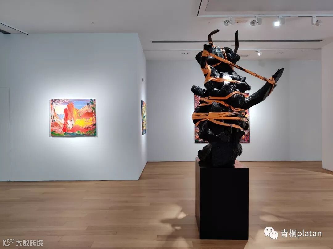 这次新个展主要呈现了尹朝阳十余幅风景系列油画,三件雕塑,及艺术家对于材料进行全新探索的装置作品。数年间,嵩山一直是尹朝阳写生的蓝本。如今,他直接从山石上脱模复制局部,然后在粗糙的肌理表面上敷以蓝色、绿色的矿物颜料。展览中的《青》、《绿》两件作品即是如此制作,极简的块面和颜色透出高古、雄浑的意趣。两件装置从风景系列中延伸而来,成为尹朝阳开启的全新创作方向。三件雕塑作品时间跨度近十年。《膨胀》(2008)中,人被外物挤压致变形,《异形》(2007-2008)大理石人物的自身产生异化。到了新近创作的《异形》(2019),先将木头表面烧焦成碳,再用沥青油漆一层层涂刷完全变异成恶魔的生命体,最后将其捆扎束缚。材料和制作方法愈发复杂,形态也更加有张力。三者连贯成一条精神线索,是尹朝阳对于现实社会与内心的关照思考。