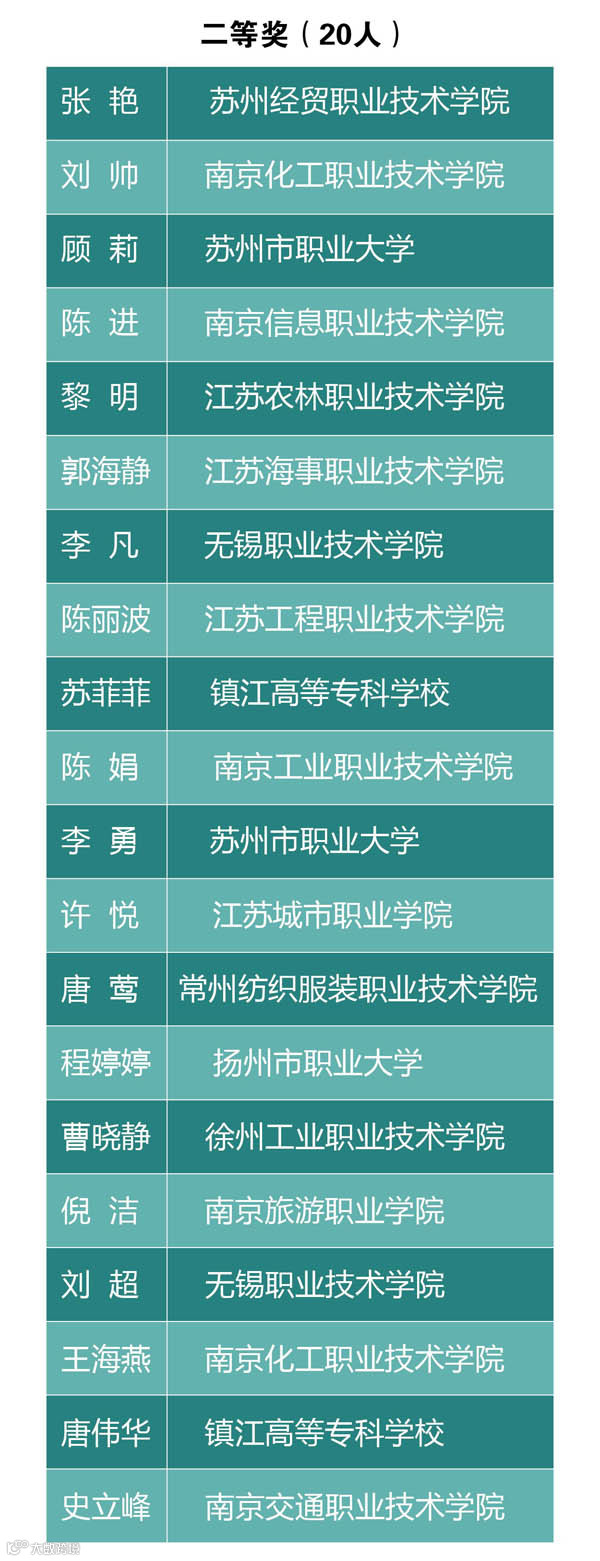 2014年江苏省高职高专院校体育教师微课教学比赛共收到44所高职高专院校的79件参赛作品,经过网络评审、会议评审,产生一等奖10名,二等奖20名,三等奖30名,获奖具体名单如下: