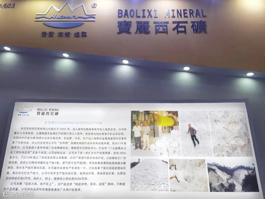 在本届展会上,宝丽西主推纯钾长石、滑石、煅烧滑石、钾长石、膨润土、蒙脱石、高纯石英砂/粉、霞石、钠长石、高岭土/球土/煅烧铝土。目前,宝丽西拥有球磨机生产线9条,煤气烘干生产线3条,并且配备有高性能高纯度水磨除铁,脱水生产线和高纯石英,长石酸洗处理生产车间各一个,已经具备了国内刚需的高纯石英,高纯长石的生产能力。