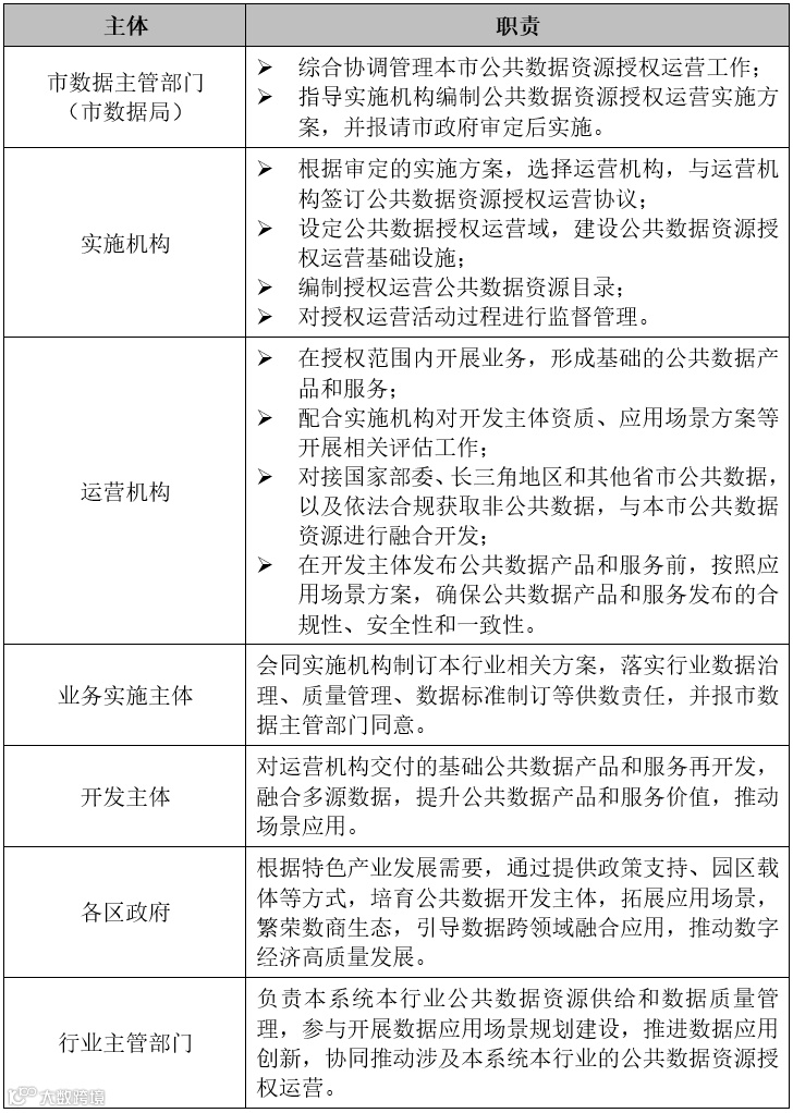 结合《管理办法》的规定,参与上海市公共数据资源授权运营的各类主体及其职责如下: