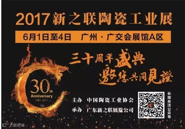 2017新之联陶瓷工业展将于6月1- 4日在广交会展馆A区盛大开幕。今年也恰逢是陶瓷展的30周年,正所谓三十而立,今年的陶瓷展无论从展览面积还是展商数量都上了一个新台阶。