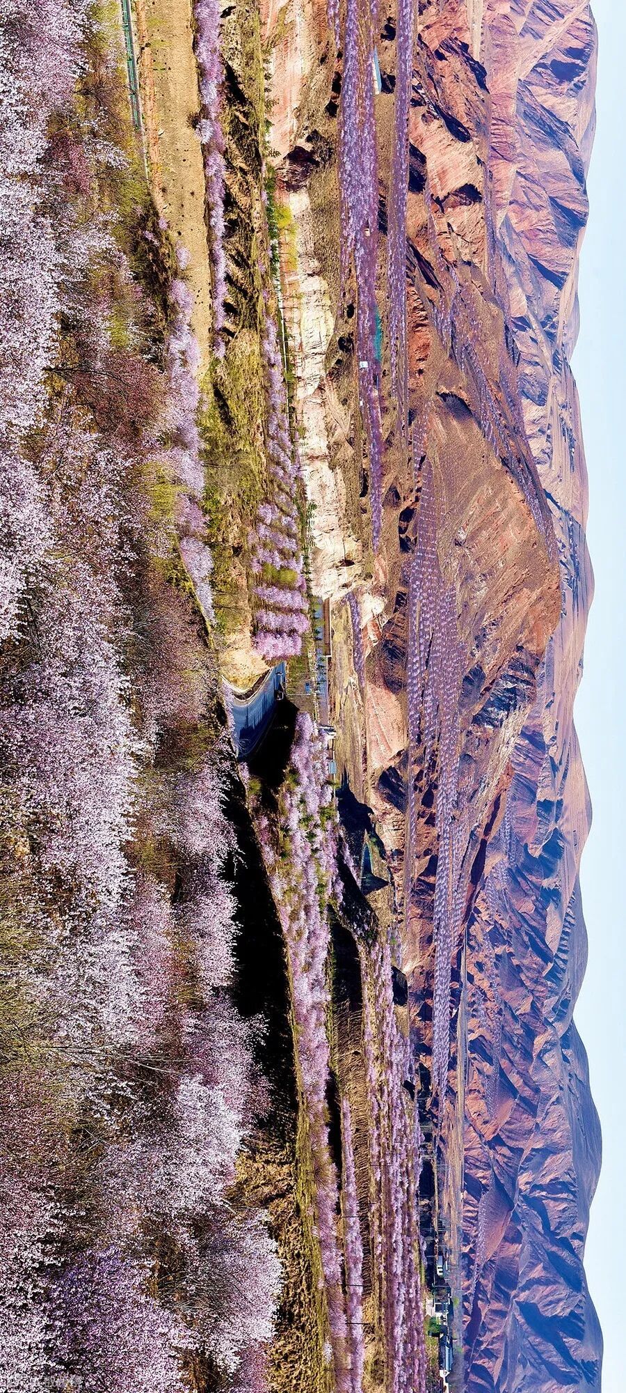 奇绝险峻的山崖与柔和秀美的桃林相互融合