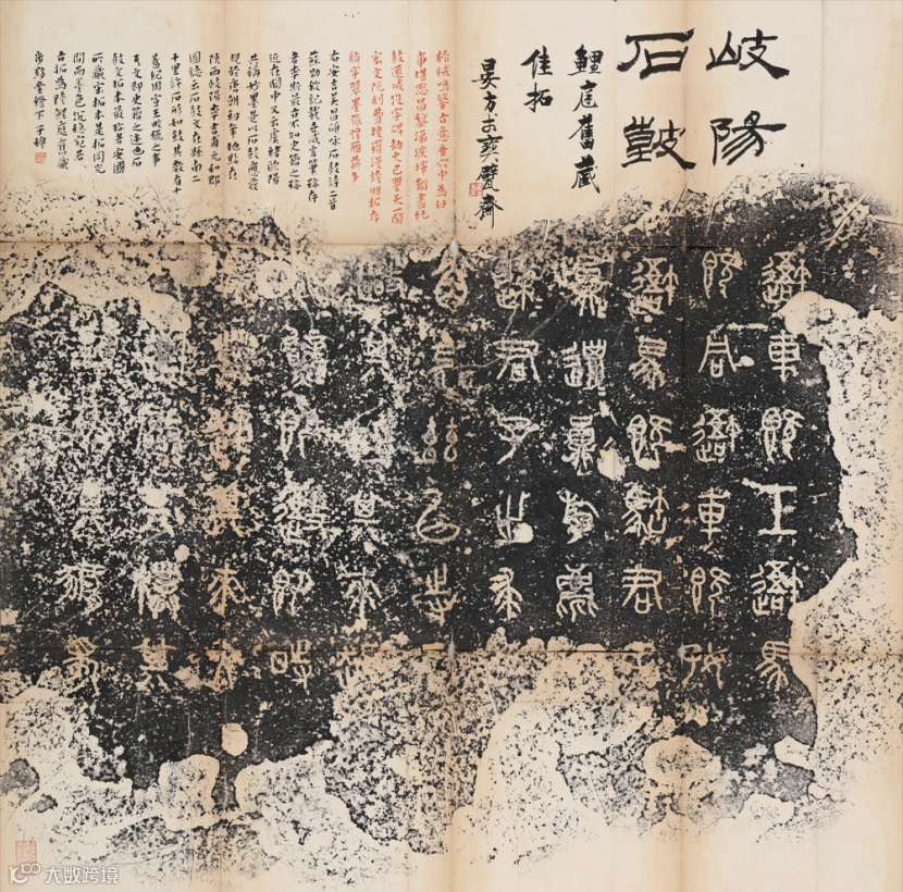 海上童晏方先生隶书题甲鼓拓本之首:“岐阳石鼓。鲤庭旧藏佳拓,晏方于宝甓斋。”步黟堂主人朱墨双题,录缶翁咏石鼓诗及石鼓相关史料。