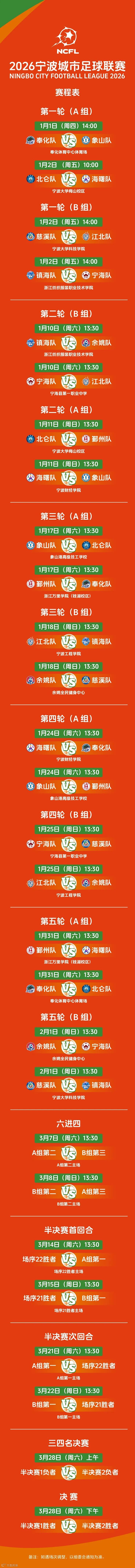 2026年宁波城市足球联赛完整赛程公布!点击查看余姚队赛程→