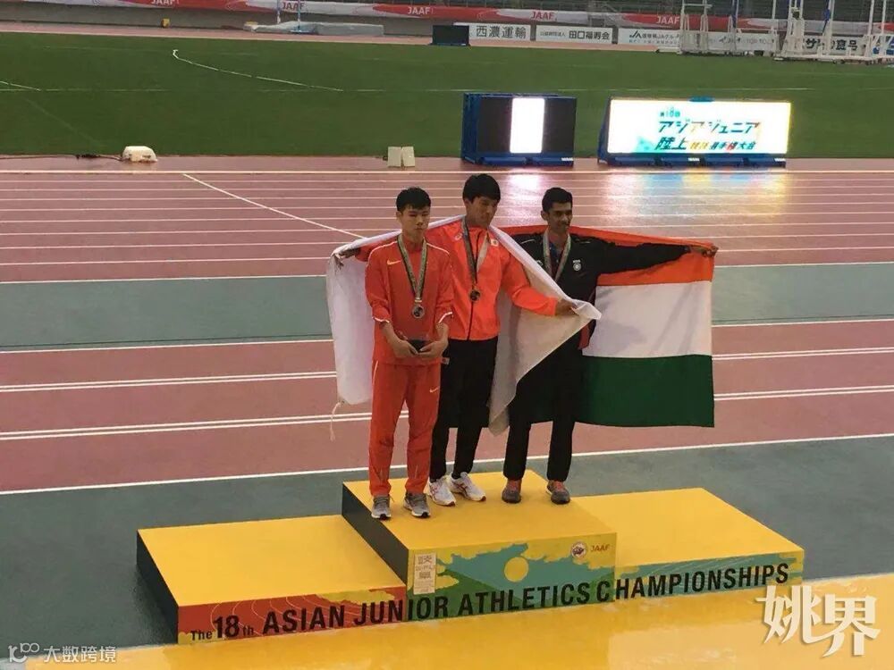 周科琦在2018年6月7日亚洲青年田径锦标赛的领奖台上。