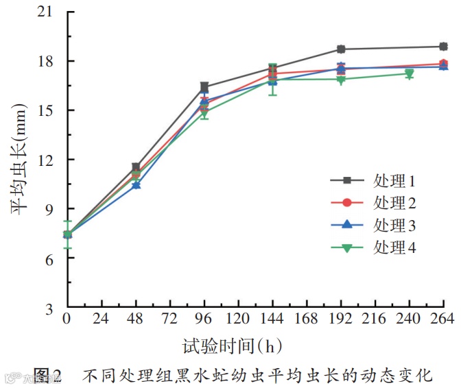 试验第48、96、144、192 h和240 h随机采集幼虫样品,平均虫重采用随机称取30只不同生长期黑水虻幼虫虫重,并折算单只幼虫重量,以mg/Larvae为单位;平均虫长采用随机测量10只不同生长期黑水虻幼虫的虫长,并折算平均值,以mm/Larvae为单位。