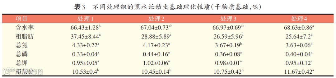 不同处理组的黑水虻幼虫的基础理化性质如表3所示,处理1~处理4的黑水虻幼虫虫体含水率分别为66.43%,67.04%,66.97%和68.63%,处理2和处理3的黑水虻幼虫虫体含水率与其他处理组之间没有显著差异(P>0.05),而处理1的黑水虻幼虫虫体含水率显著低于处理4(P<0.05),可能是由于自身生命系统的调节,使黑水虻幼虫虫体的含水率保持着一定程度的动态平衡,投虫密度差距较大时会对黑水虻幼虫的含水率产生影响。
