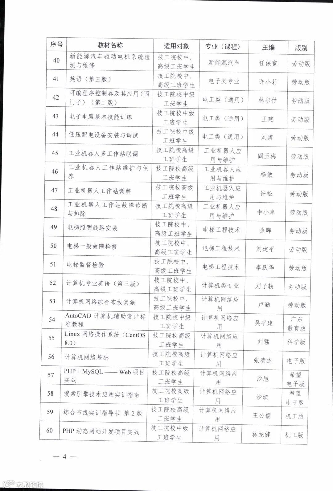 人力资源社会保障部办公厅关于公布429种国家级技工教育和职业培训教材目录的通知