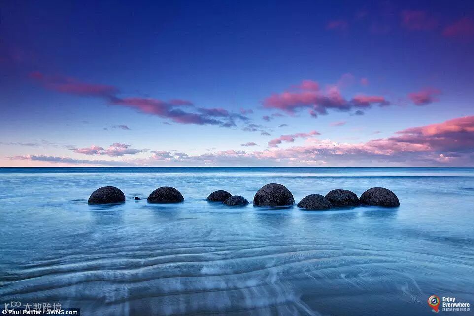 据保罗介绍,拍摄日出和日落很大程度上取决于天气和光线。每到一处,他都一定要得到几张自己满意的照片才肯罢休。据称,拍摄时有三个阶段;黄昏时分,当太阳即将撞向地平线的那一刻,光芒倒印水中,画面精美绝伦;随后短短5分钟内,澄澈的金色地平线处光芒万丈;最后一刻则是日落后的20分钟,明亮的颜色印染了整个天际。
