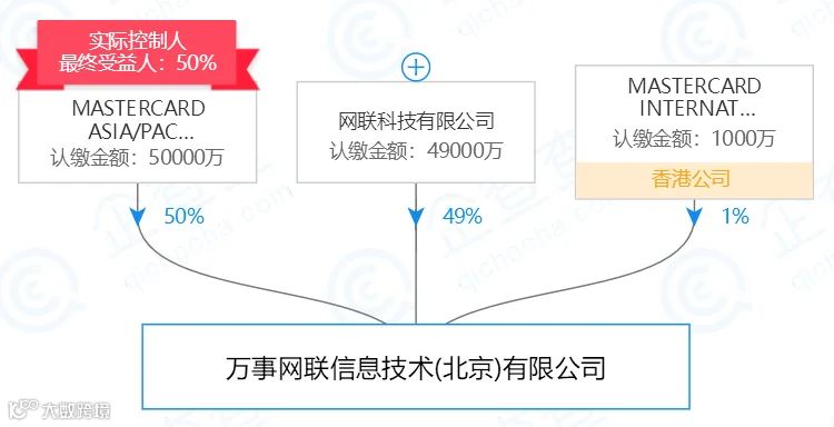 网联通过网联科技持有了万事网联49%的股权,而另外50%和1%的股权由万事达卡的两家子公司MASTERCARD ASIA/PACIFIC PTE.LTD.(万事达卡亚太)、MASTERCARD INTERNATIONAL INCORPORATED(万事达卡国际)分别持有。