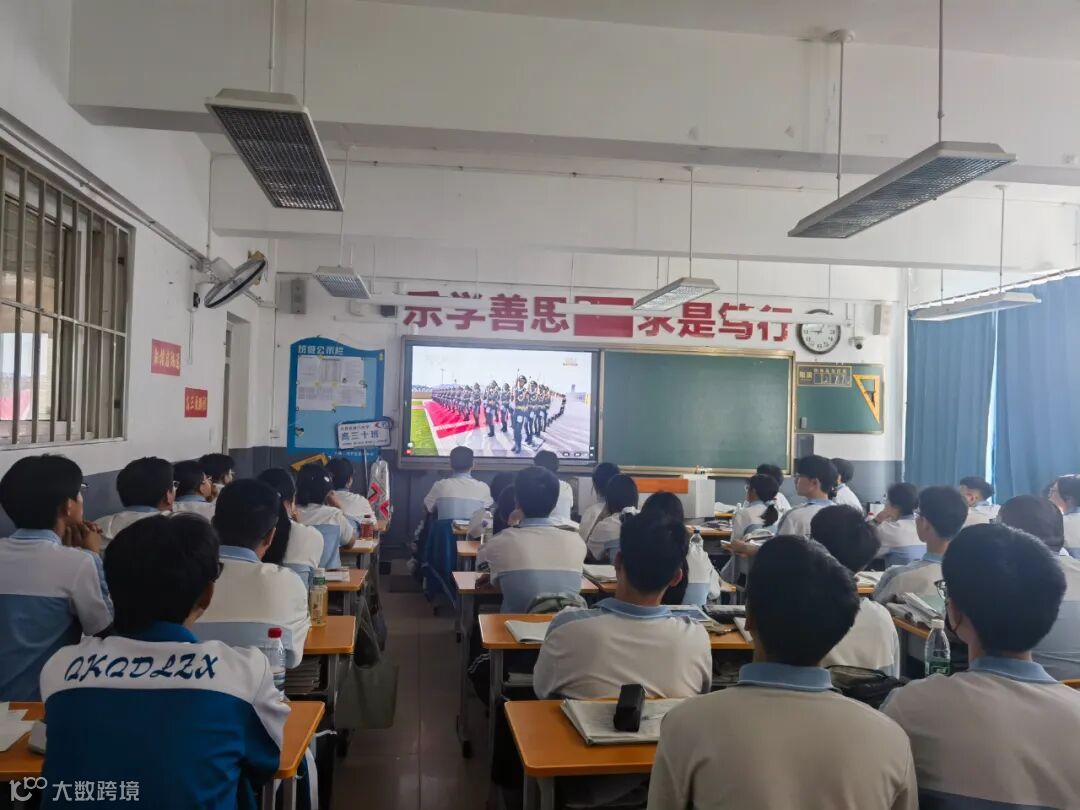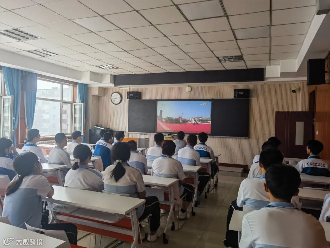 屏幕中受阅方队迈着铿锵有力的步伐依次通过天安门广场,踢正步时整齐划一的脚步声透过音响震撼着每一位同学的心灵;铁甲洪流般的装备方阵缓缓驶过,先进的武器装备彰显着国家的硬核实力;空中梯队划破长空,留下绚丽的彩烟,引得教室内不时响起抑制不住的惊叹与掌声。