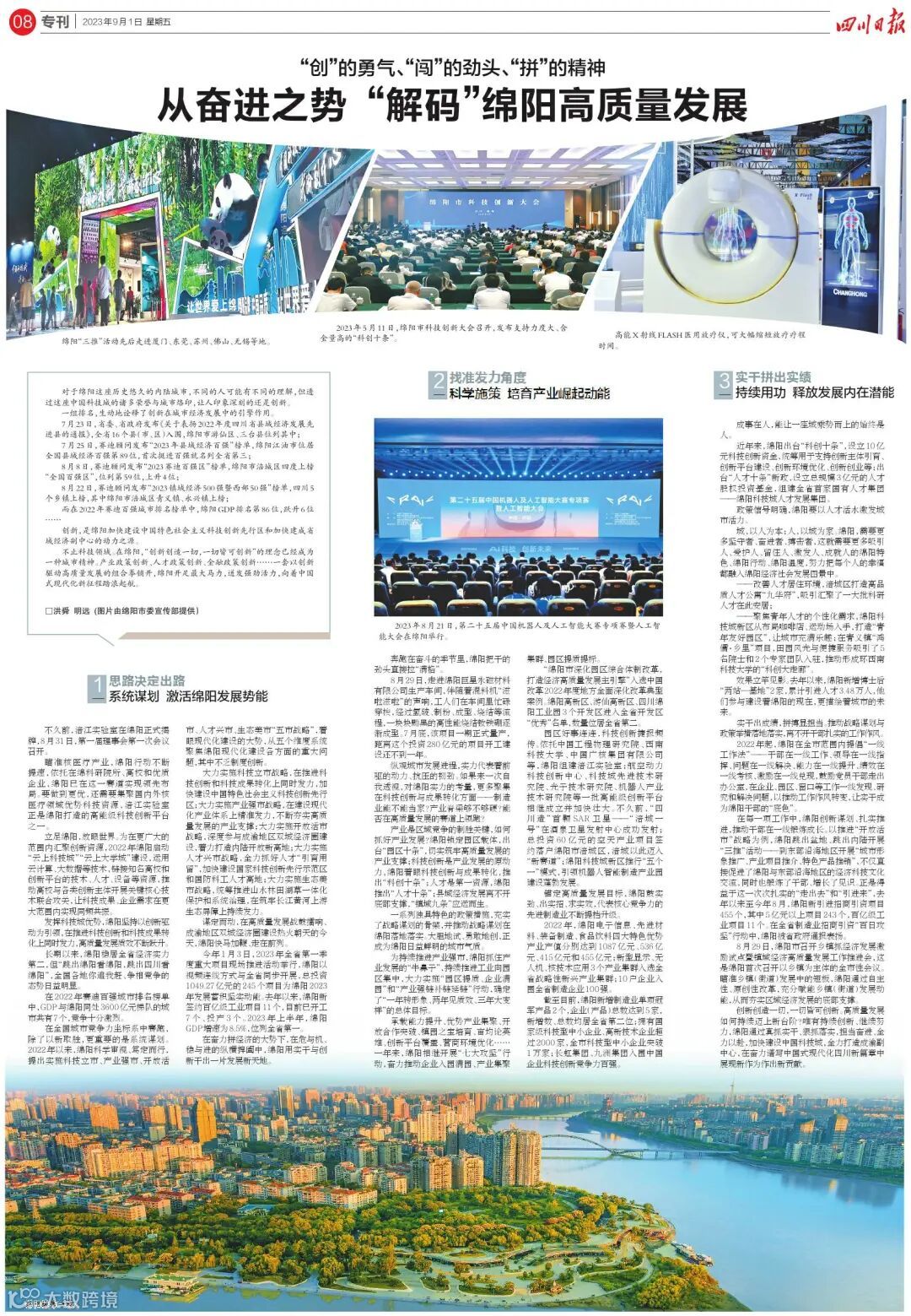 今天(9月1日)出版的《四川日报》,用一个整版刊发题为《“创”的勇气、“闯”的劲头、“拼”的精神 从奋进之势 “解码”绵阳高质量发展》的深度报道,以“创新创造”为主线,点赞绵阳在坚持创新引领,实施“五市战略”,全力以赴拼经济、搞建设、抓发展上的亮点举措和显著成效,为绵阳高质量发展写下生动注脚。全文如下: