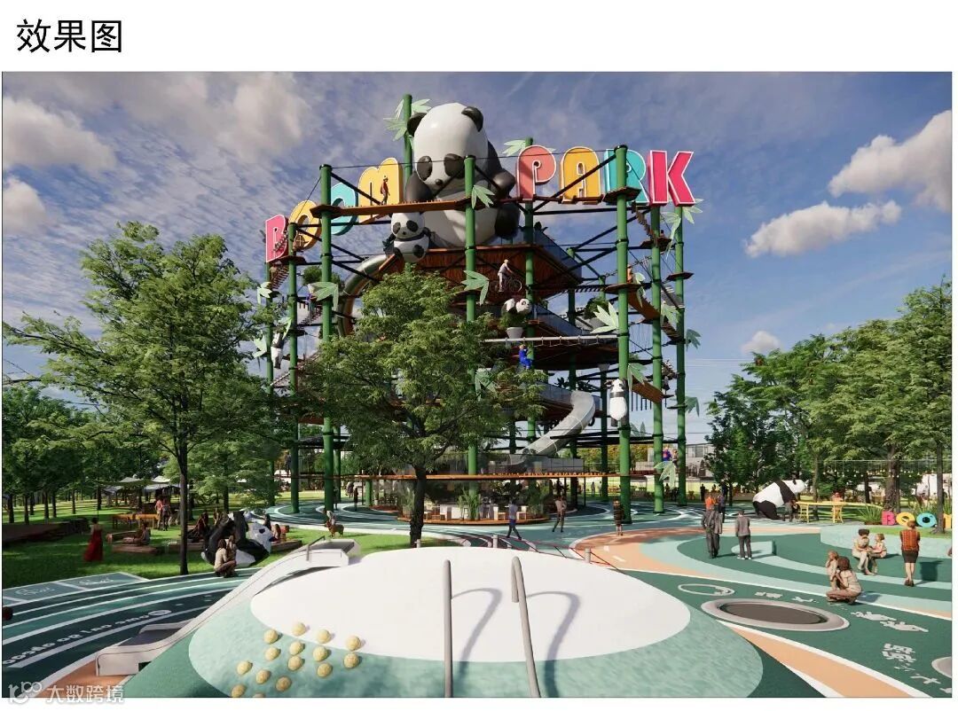 增加以熊猫主题为主的休闲广场、攀爬矩阵、攀爬线路绿道景观及配套设施;